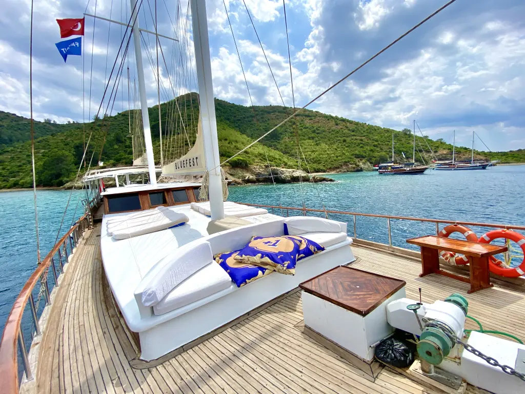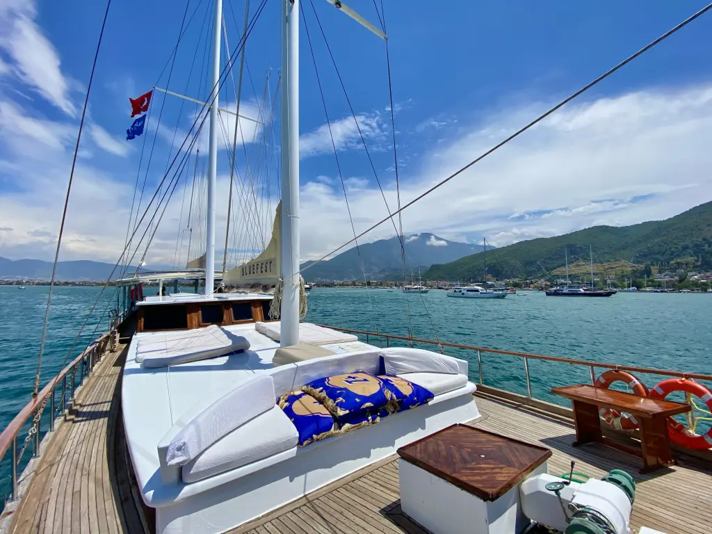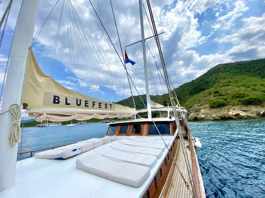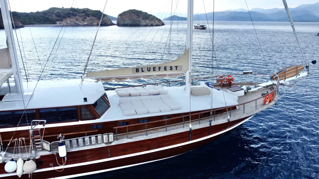Яхтата Bluefest е модел Gulet произведена от Custom Manufacturer през 2005. Тя е чудесен избор и се дава под наем от Fethiye port в района на Турция. Bluefest разполага с 8 каюти и е подходяща за до 18 гости, заедно с екипажа. Дължината и е 27 метра и гази 0 метра. Bluefest разполага с комерсиален лиценз и се оперира професионално от чартърната компания Farout Yachting - Turkey.