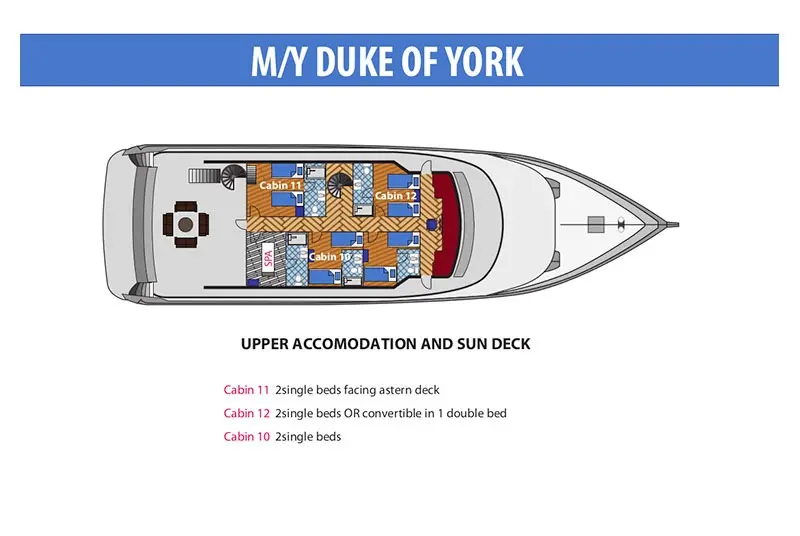Яхтата Duke of York е модел Motoryacht произведена от Custom Manufacturer през 2010. Тя е чудесен избор и се дава под наем от Hulhumale в района на Малдиви. Duke of York разполага с 11 каюти и е подходяща за до 25 гости, заедно с екипажа. Дължината и е 36 метра и гази 3 метра. Duke of York разполага с комерсиален лиценз и се оперира професионално от чартърната компания Luxury Yacht Maldives.