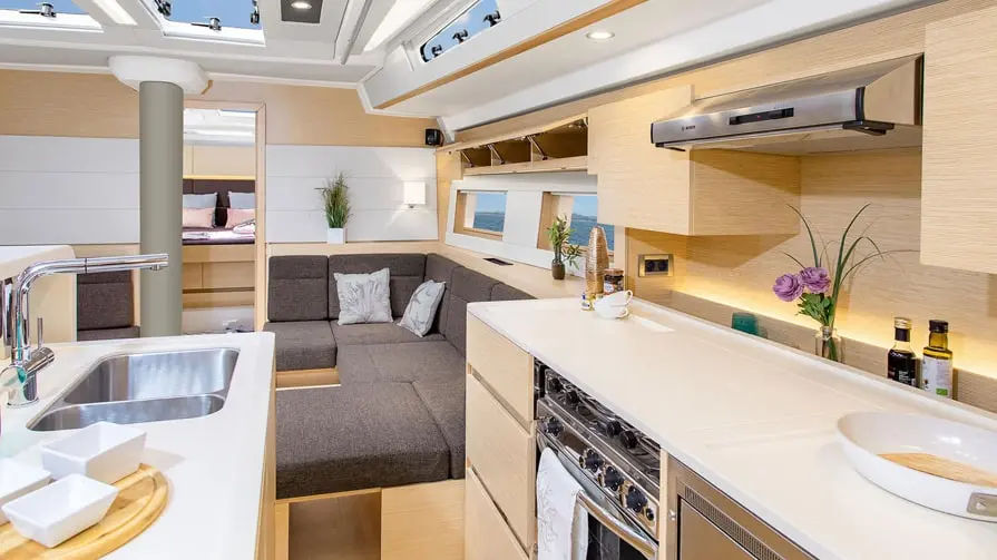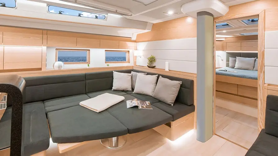 double bench seat with storage space at the saloon table, additional skipper's cabin in the bow, hull colour grey with water pass dark grey