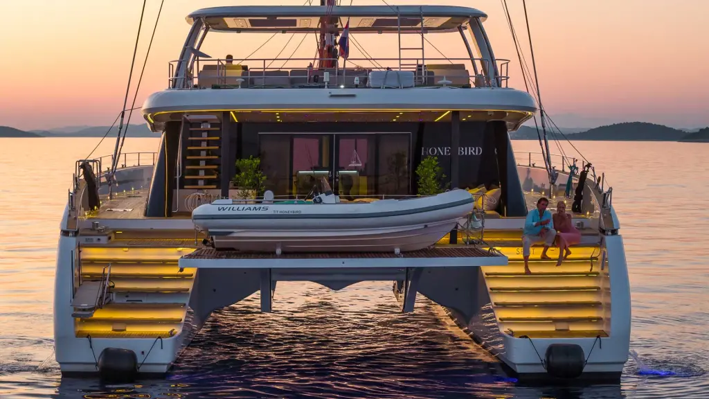 The yacht Honeybird is a model Sunreef 80 manufactured by Sunreef Yachts in 2019. It is a perfect choice and is to be rented from Marina D-Marin Mandalina in the area of Croatia. Honeybird has 3 cabins and is suitable for up to 6 guests including the crew. Its length is 23.99 metres and the draught - 2.2 metres. Honeybird has the respective license and is operated professionally by the yacht charter company Touch Adriatic.