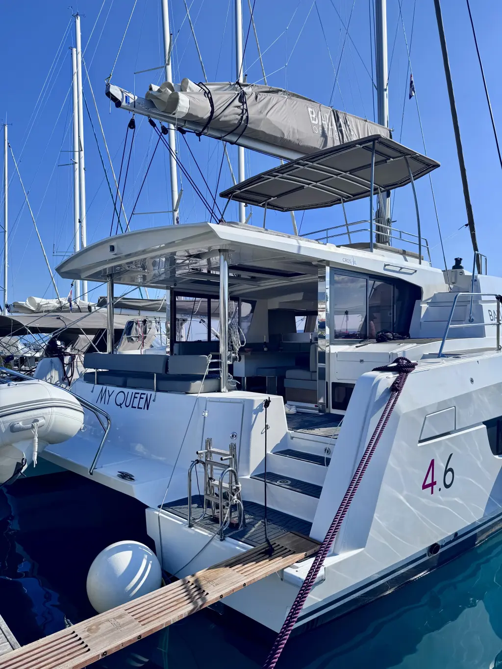 The yacht MY Queen is a model Bali 4.6 manufactured by Bali Catamarans in 2023. It is a perfect choice and is to be rented from Marina Novi in the area of Croatia. MY Queen has 6 cabins and is suitable for up to 10 guests including the crew. Its length is 14.28 metres and the draught - 1.22 metres. MY Queen has the respective license and is operated professionally by the yacht charter company Crosail.