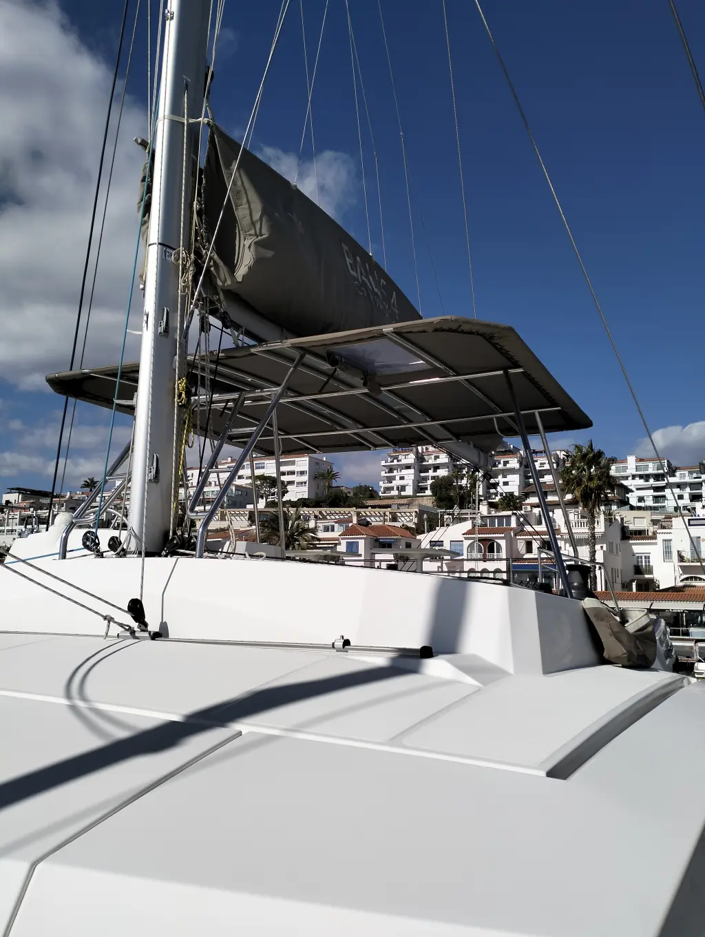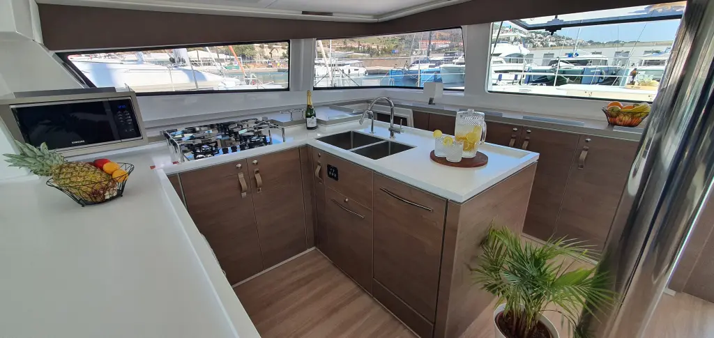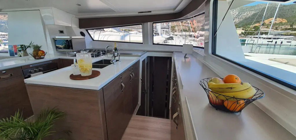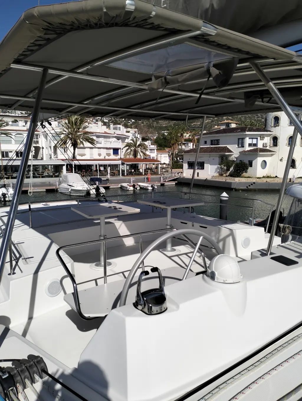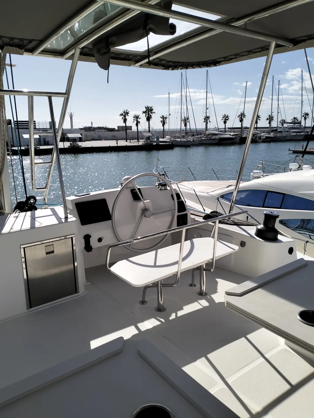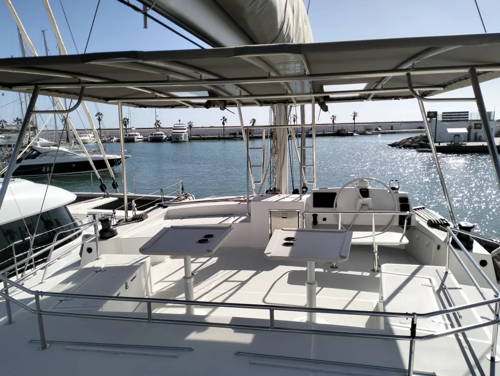 Comfortable swim ladder with large handles and teak steps